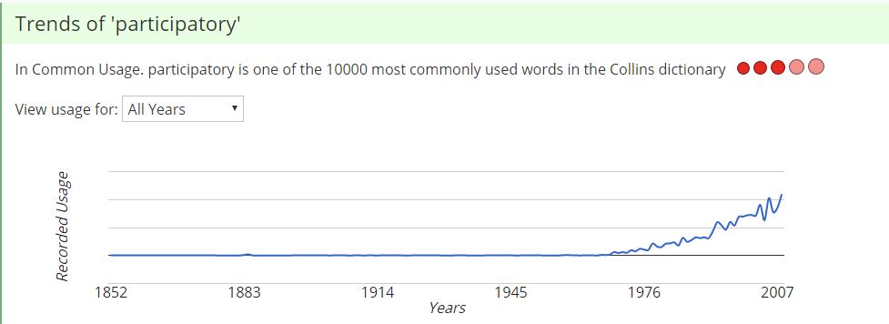 Merriam-Webster dictionary defines participatory as “characterized by or involving participation especially: providing the opportunity for individual participation” (Merriam-Webster, 2019). I was curious to see the history of the use of this word and the graph below clearly aligns with my thoughts on this subject. The use of the word starts to trend in the 1970s. Eminent Sociologist Manuel Castells had observed that the engineering innovations of the internet were accomplished by graduate students and that they were ‘permeated with the values of individual freedom, of independent thinking, and of sharing and co-operating with peers- all the values that characterized the campus culture of the 1960s” (Castells, 2001, p.24). During that same period, the idea of ‘gifting’ was also present in the hacker culture when students in academia and science were able to share code, modify it and re share it (Anderson, 2012). The point I want to make is that this participatory environment has been the bedrock of the internet since its conception. So it may be no surprise the increased use of the word participatory aligns with this explosion of the internet during that period.