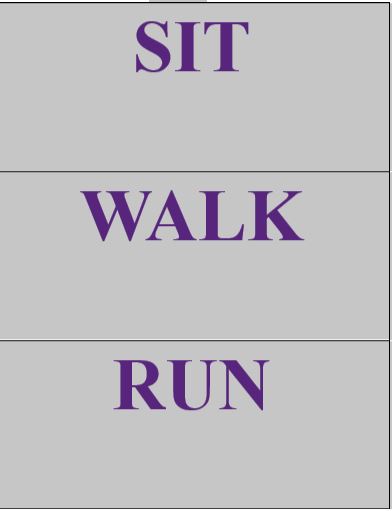 Flash cards of the words: Sit, Walk, Run, Jump,