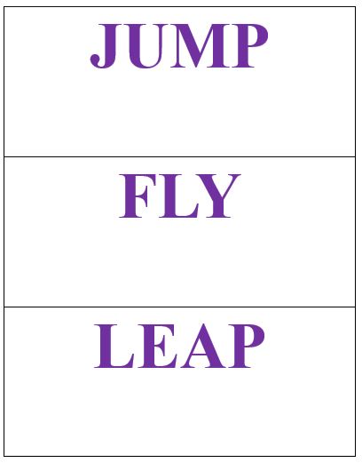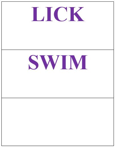 Introduce the following words: Sit, Walk, Run, Jump, Leap, Fly, Swim, Lick using the flash cards.